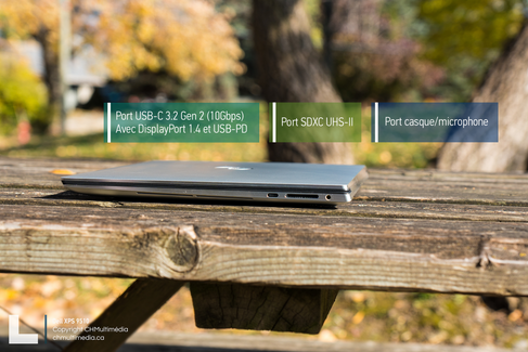 Tous ces ports supportent le standard USB-PD, qui permet la recharge jusqu’à 100W, mais aussi le chargeur Dell de 130W. Choisir librement le côté de chargement est certainement un plus. Il y a aussi un logement de câble de sécurité à gauche et pour finir, un port pour écouteurs et un port pour carte SDXC UHS-II très rapide.